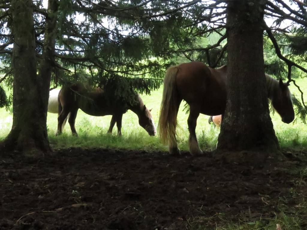 Les chevaux au Berbois vivent dans plusieurs prés d’une dizaine d’hectares, en tournant sans cesse pour qu’il n’y ait pas besoin de complémentation à la belle saison. Forêts, pentes, sols rocheux, combes en herbe, le terrain est très varié. De novembre à avril, il est nécessaire d’apporter du foin (bio, récolté à la Pesse) sur plusieurs semaines. Les pâtures d’hiver de 30 hectares permettent aux chevaux de continuer à brouter lorsque la neige n’est pas trop importante. Ainsi, ils continuent à se complémenter en fibres, essences d’arbres, petites plantes de montagne..
