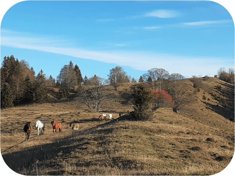 L’altitude permet de loger les chevaux au frais pour l’été ! Et d’en profiter pour découvrir les randonnées du plateau haut-jurassien. Lorsque la neige s’installe, la pension continue un peu plus bas, à proximité du village de la Pesse, dans un grand pré de 30 hectares de pâtures et forêts, en troupeau.